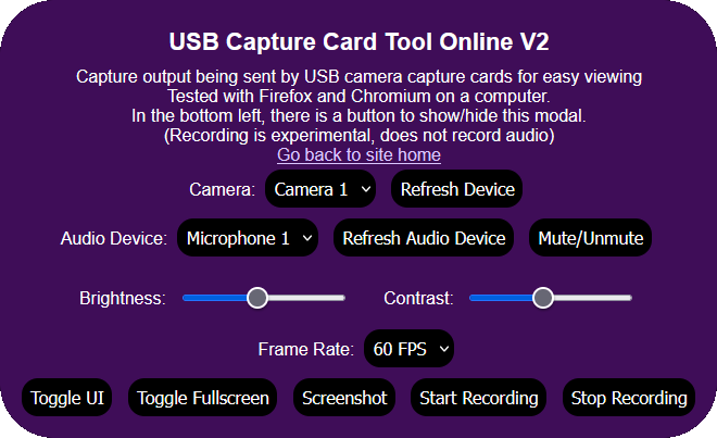 USBCCTO V2 is a tool for viewing USB capture cards in your browser. With options for resoultion, brightness and contrast, frame rate and screenshots + video recording, its easy to use on any device that supports html and usb video playback!